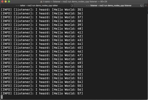 「MacOSとROS 2のインストール」で方法を詳しく書いてくれているので、簡単に動くかと思ったけど、こちらもハマる。 色々調べてなんとか、talkerデモノード、listenerデモノードの起動までできた。 問題1: talkerデモノード起動で、libPocoFoundation.60.dyl…